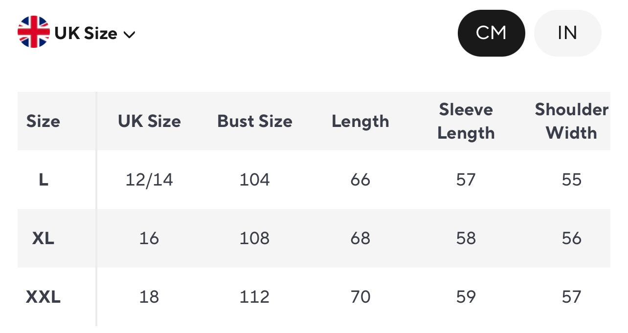 Please refer to size chart before ordering (allow 1-3cm variance) - recommend please you work with the measurements before ordering rather than the normal size you take - 1cm = 2.54 inches