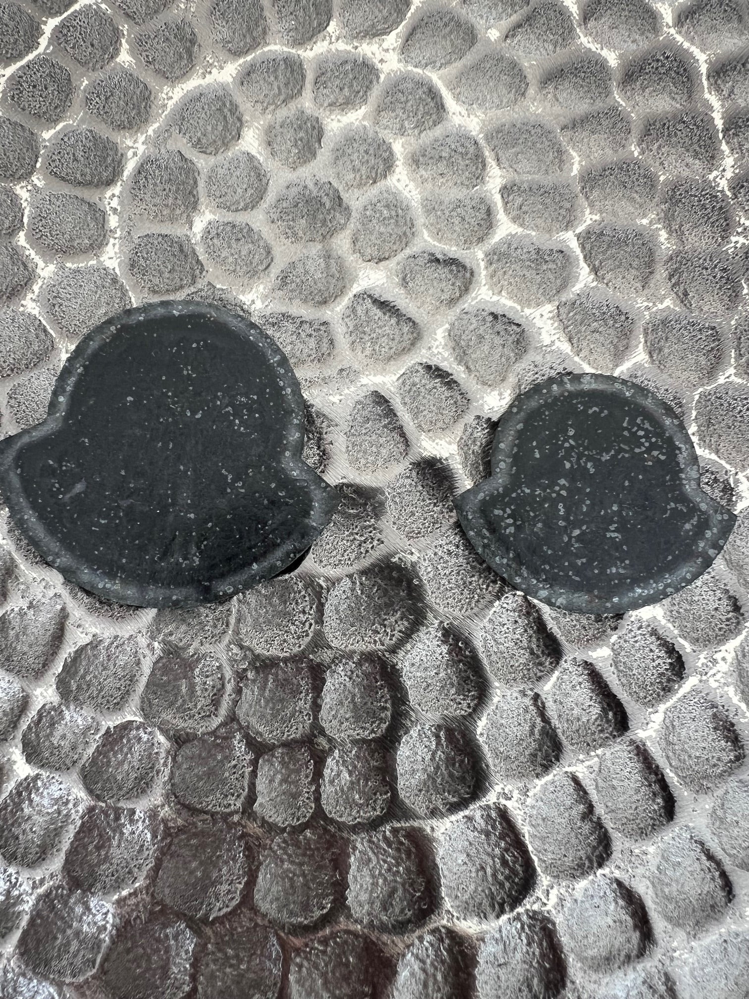 Size is 3.8cm at the widest point of the small badge and the larger one is 5cm at the widest point